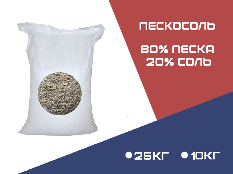 Противогололедный реагент «Пескосоль» — смесь из песка и технической соли (NaCl) для удаления льда на дорожном полотне, тротуарах, парковках, дворах, лестничных сходах. Песок предотвращает скольжение, а соль быстро плавит лед и препятствует образованию нового слоя.
